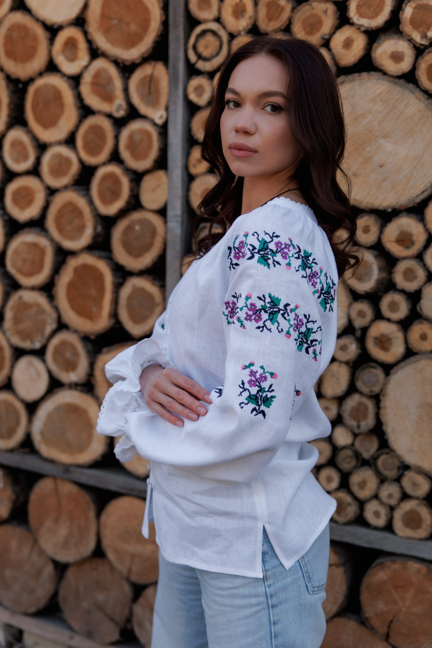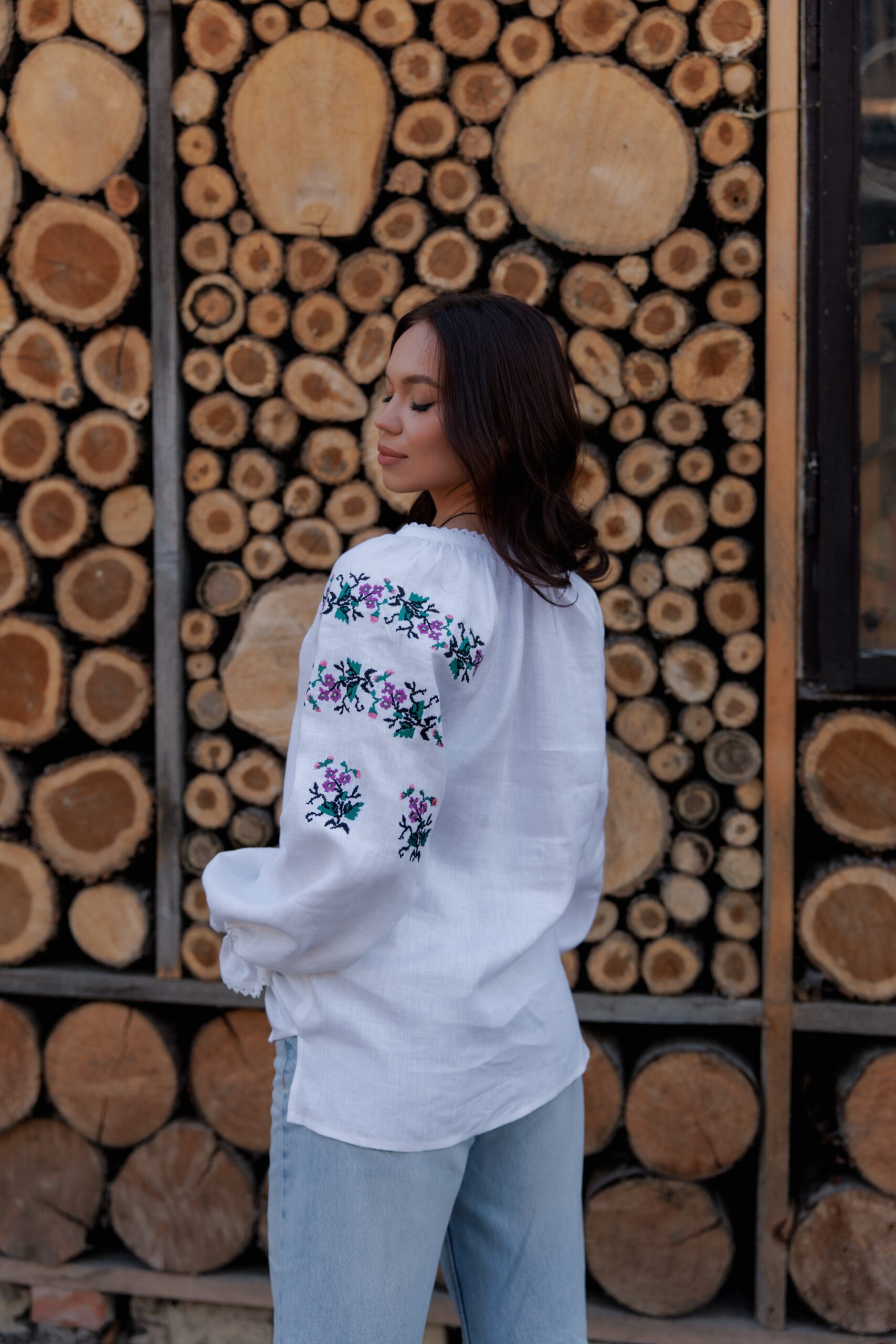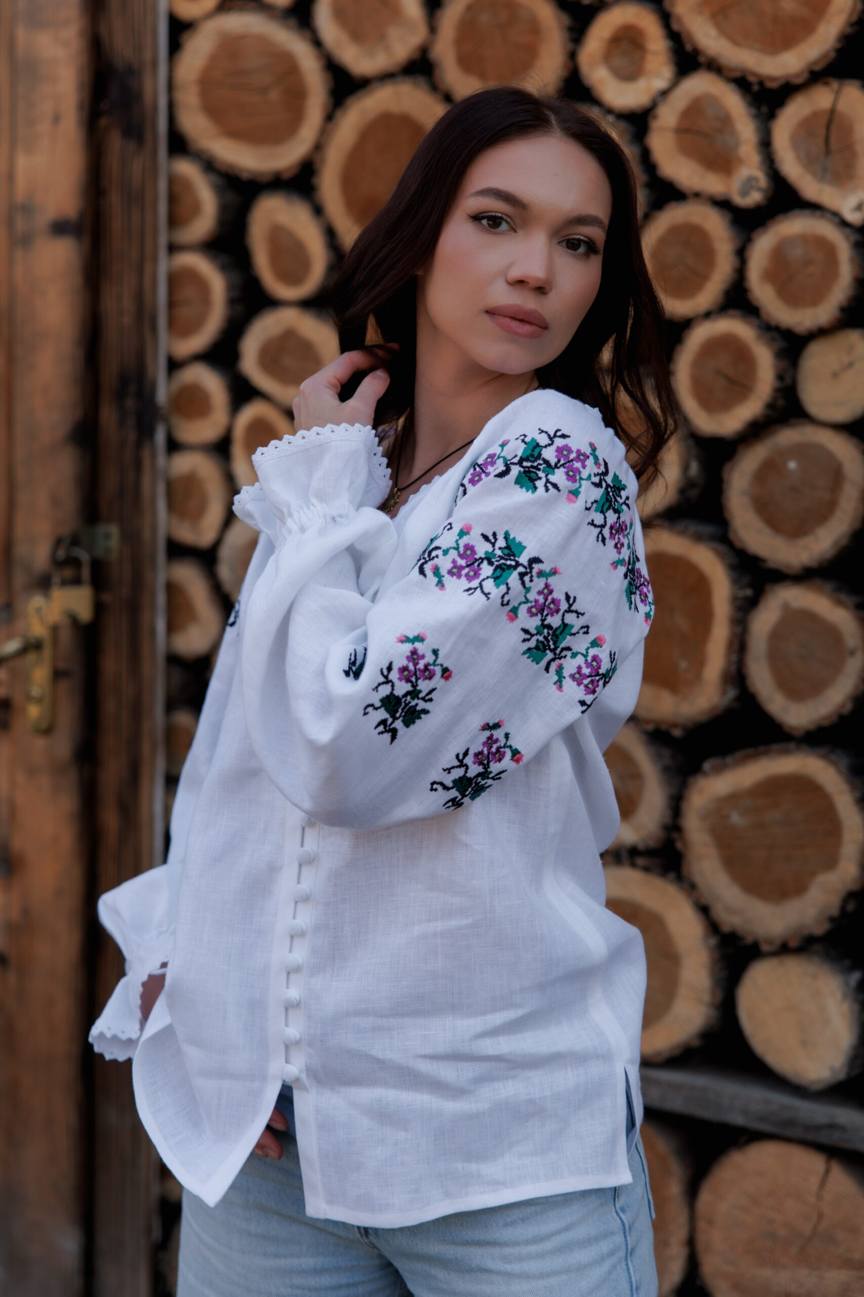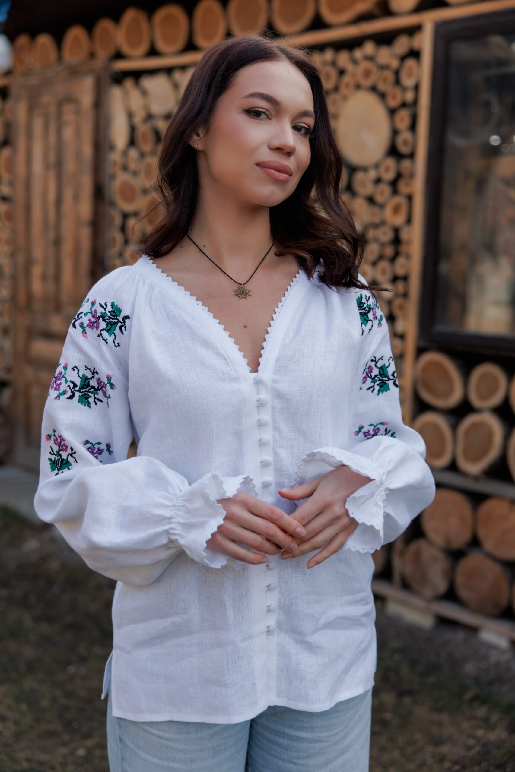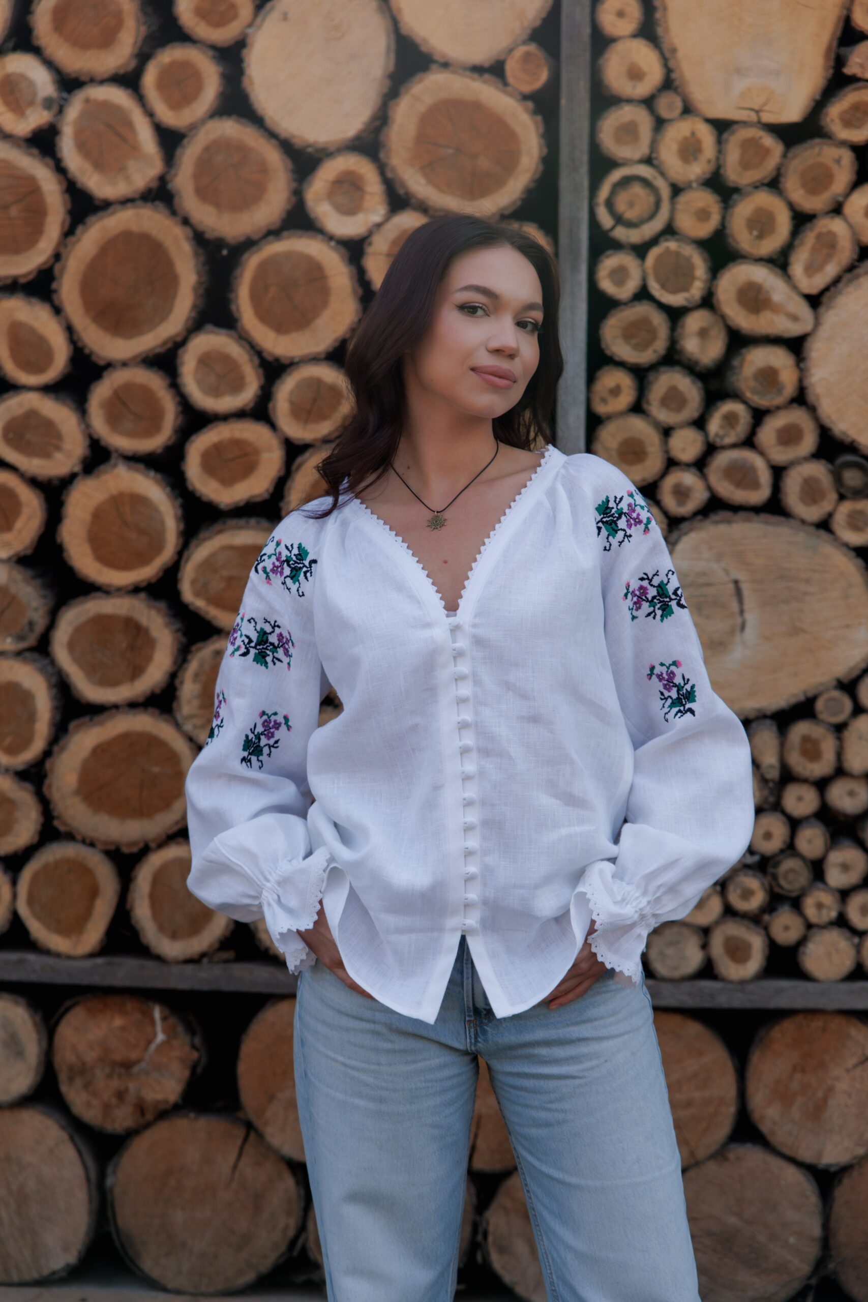 Лляна блуза вільного крою з вирізом, декорованим мереживом. Застібається спереду на гудзики, обтягнуті тканиною, під якими розташована планка.