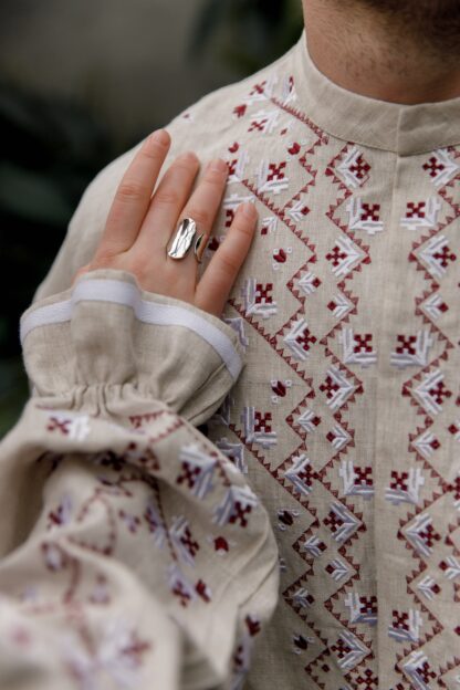 Чоловіча сорочка, виконана з натурального льону, має стильний орнамент на грудях, який нагадує цвітіння терену, додаючи виробу витонченості та оригінальності. Манжети застібаються на гудзики, що підкреслює класичний вигляд. Сорочка застібається на кнопки, поєднуючи традиційний стиль з сучасним дизайном. Ідеальний вибір для чоловіків, які шукають комфорт і елегантність в одному виробі.
