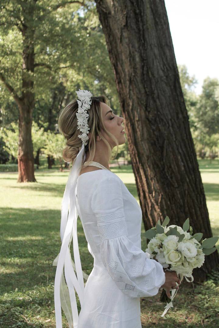 Сукня виготовлена із льону, на бавовняній підкладці. Цю модель ми відшиваємо під клієнта, оскільки важливі точні параметри замовника. Орнамент використаний із території київщини. Може бути виготовлена також в довжині міді. Ззаді застібається на замок