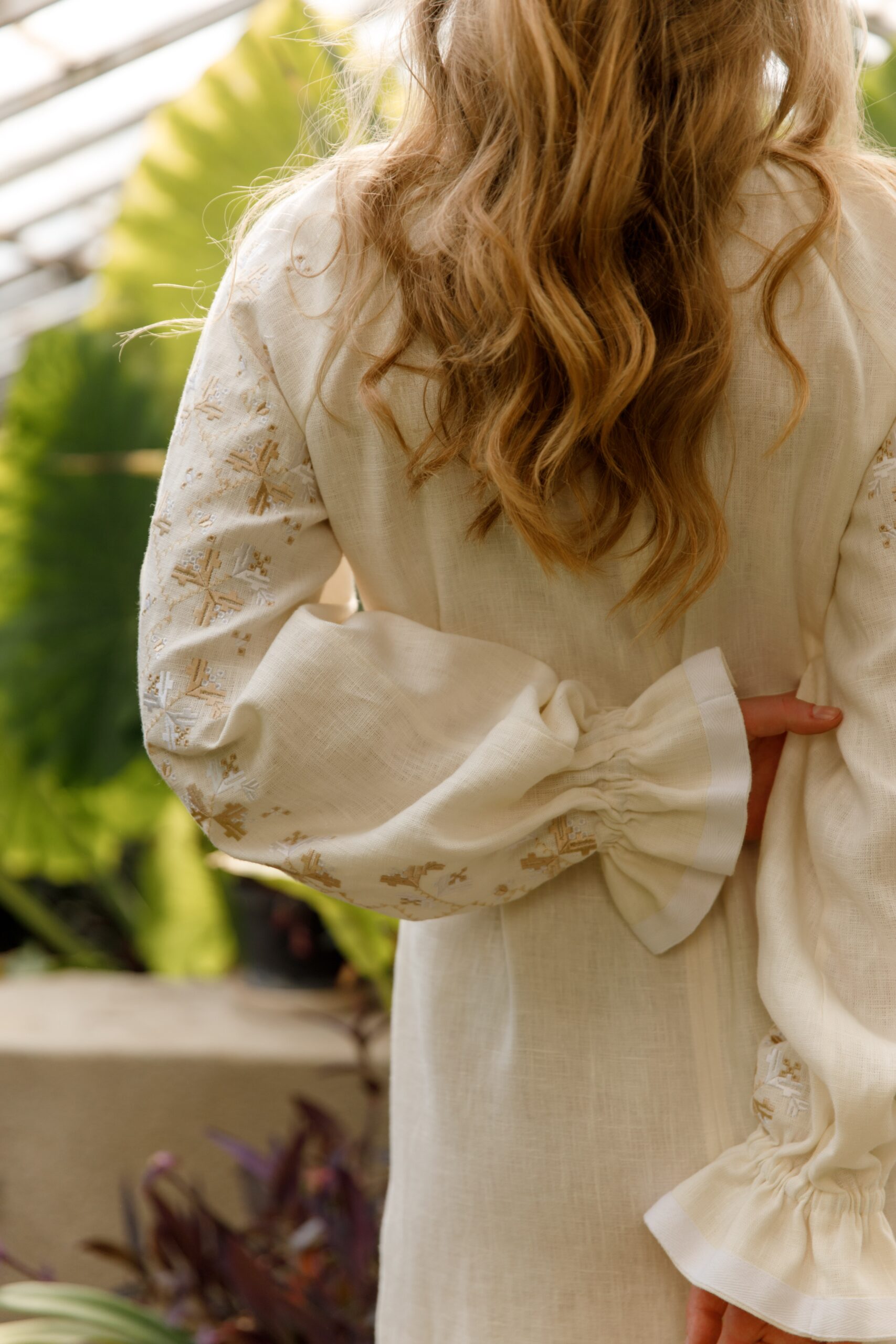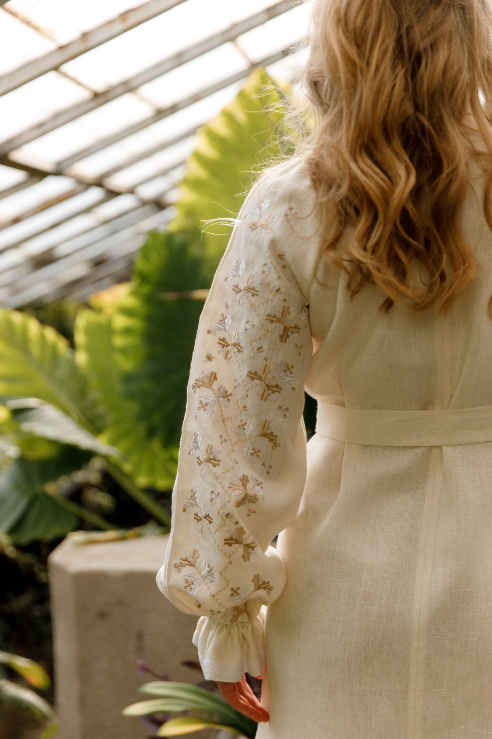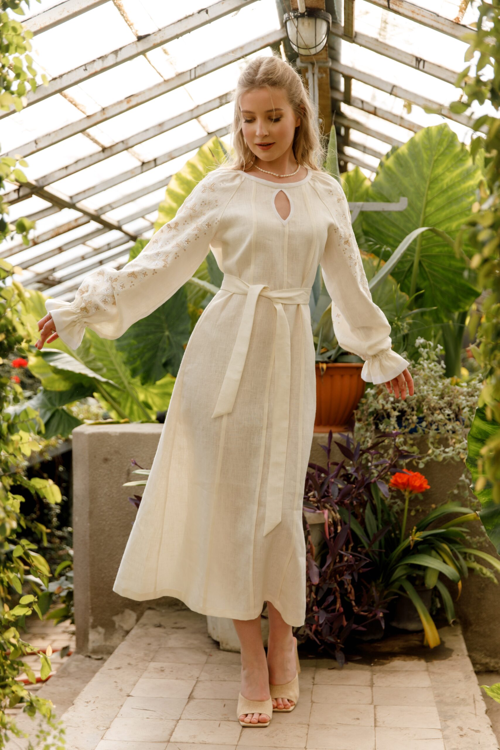 Сукня виконана із лянної тканини, декорована білими стрічками. Вишивка у техніці гладь, по переду вздовж сукні присутні “бизочки” які візуально видовжують силует