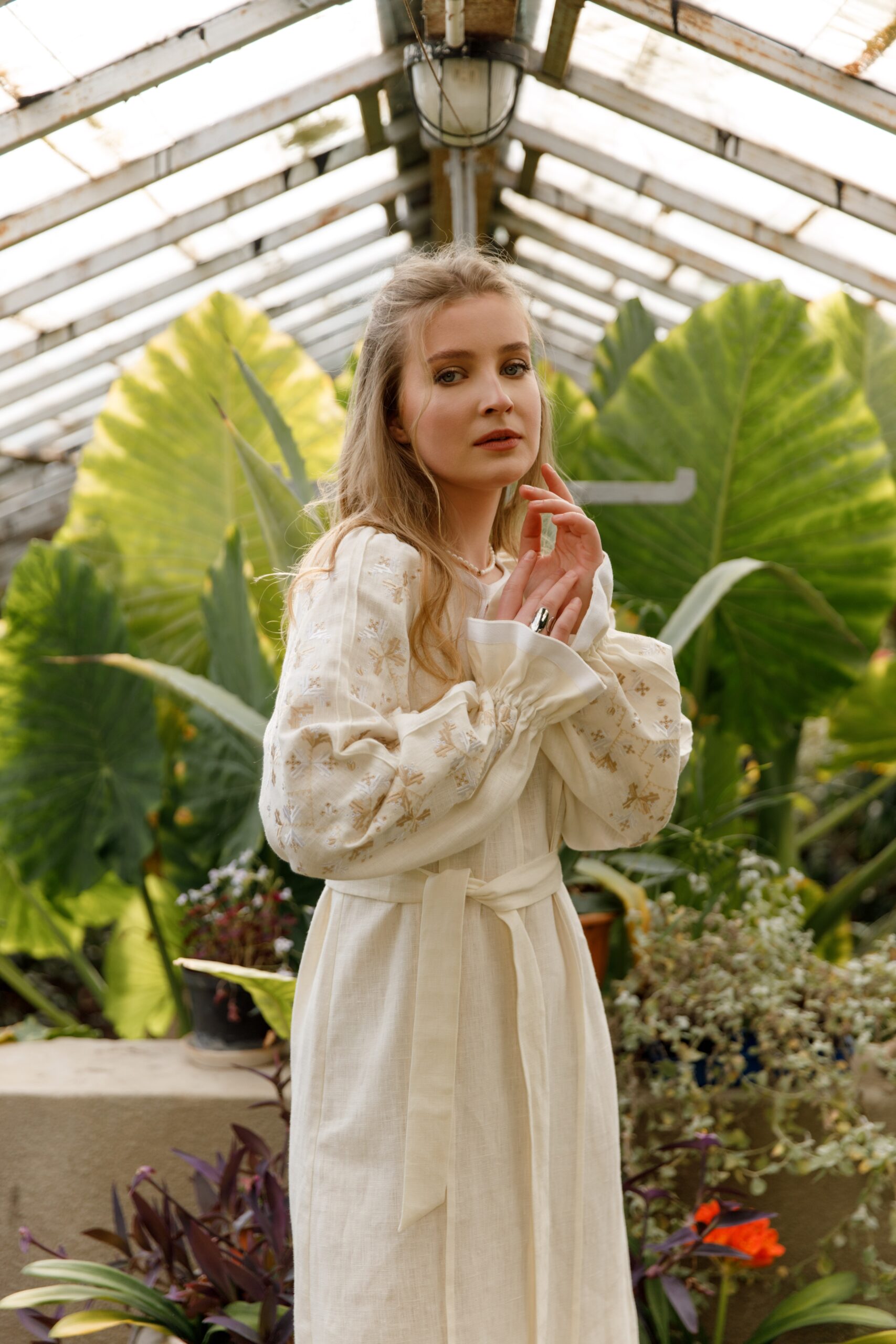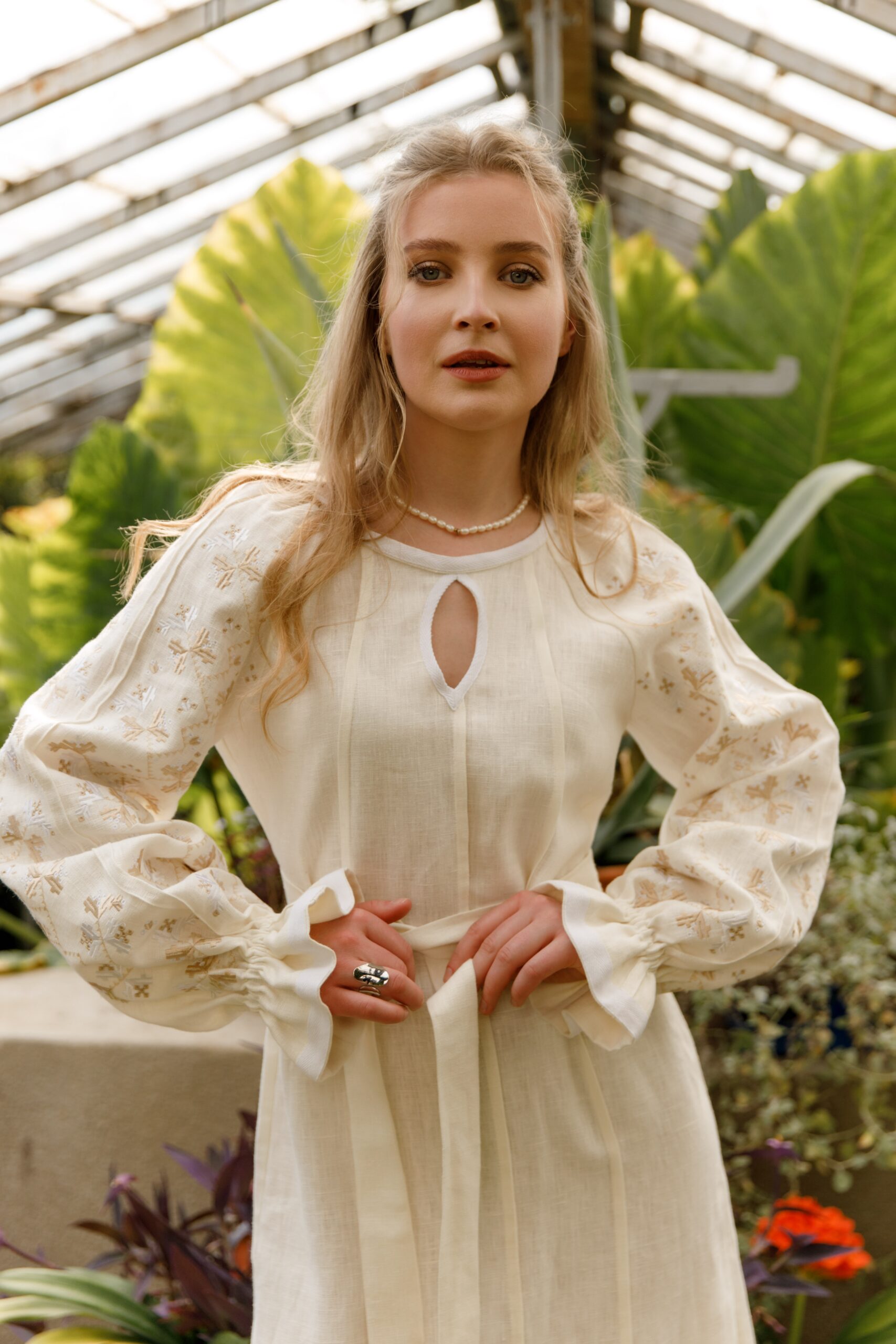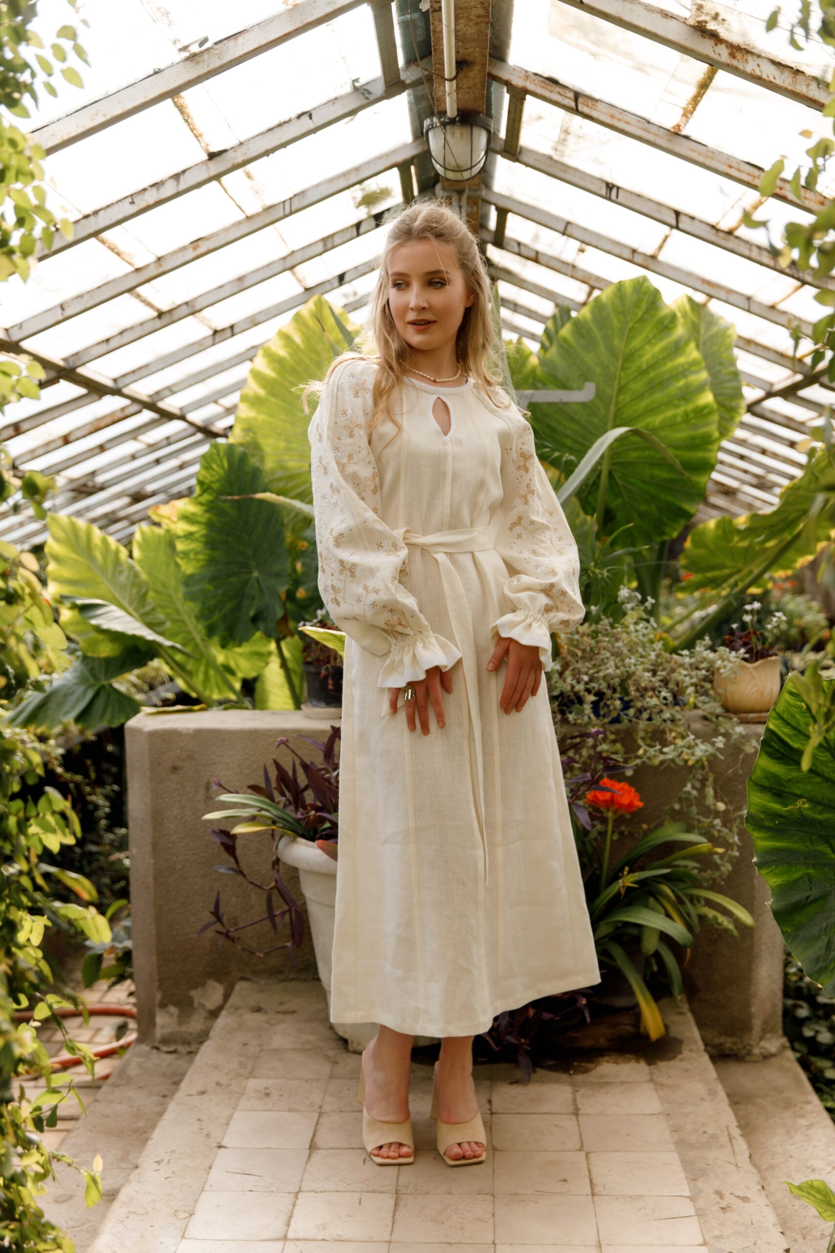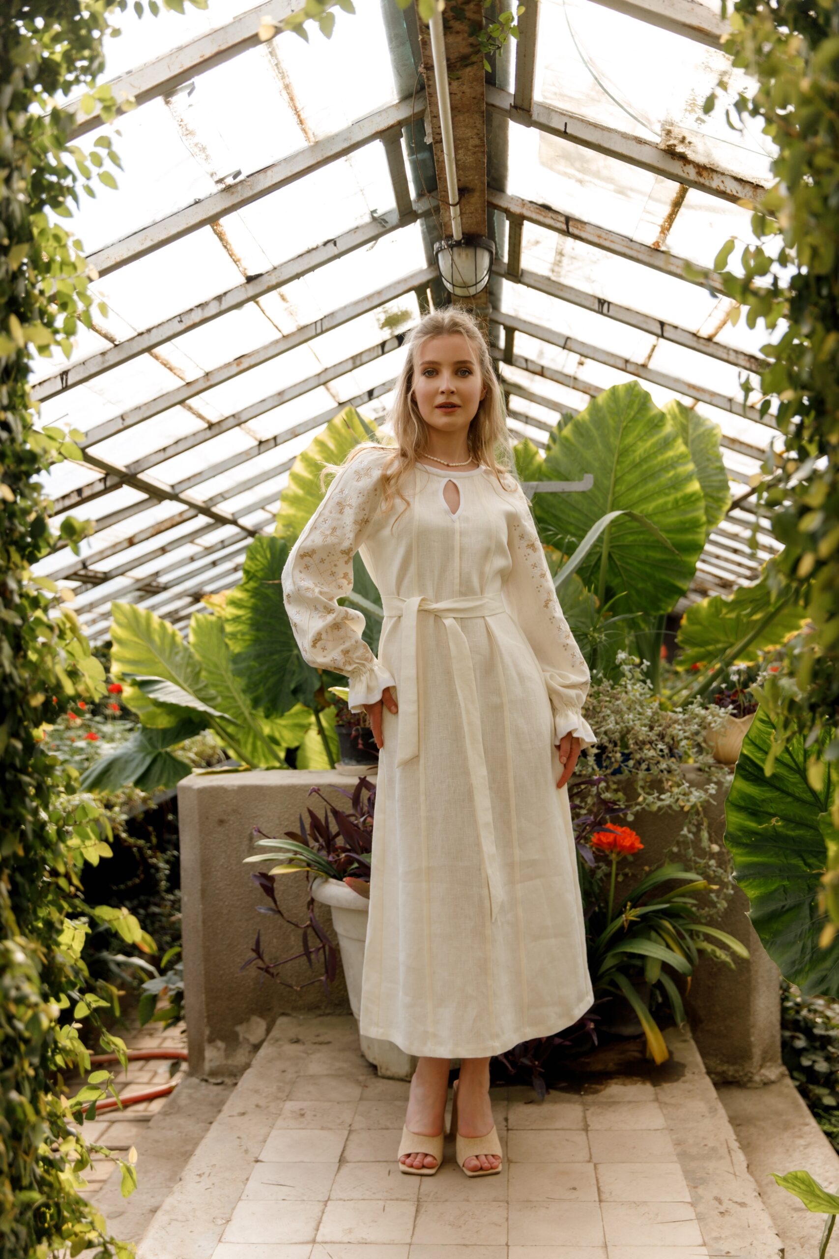 Сукня виконана із лянної тканини, декорована білими стрічками. Вишивка у техніці гладь, по переду вздовж сукні присутні “бизочки” які візуально видовжують силует