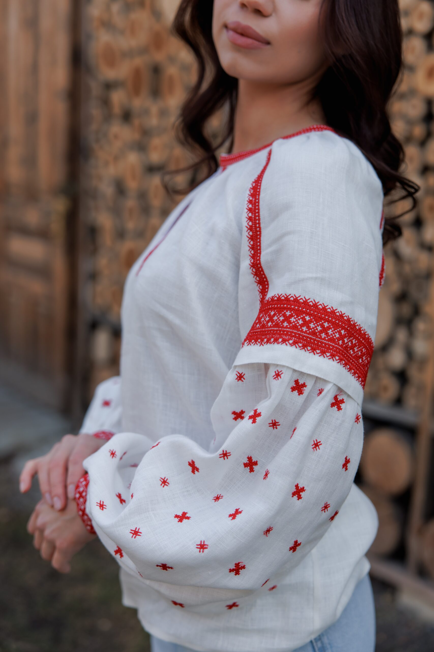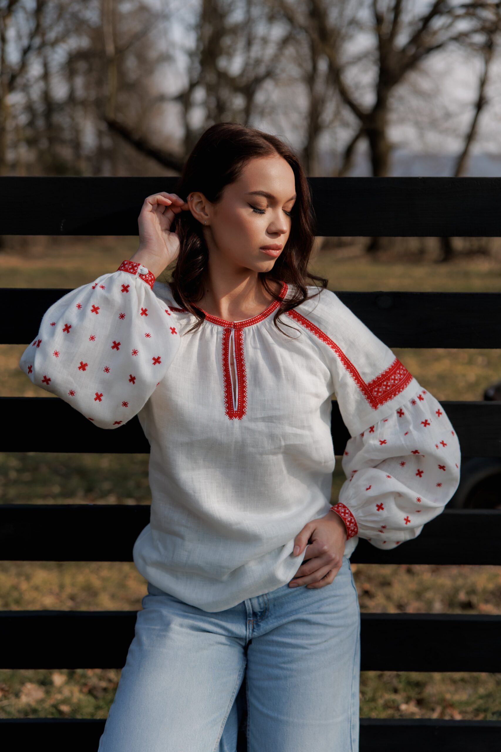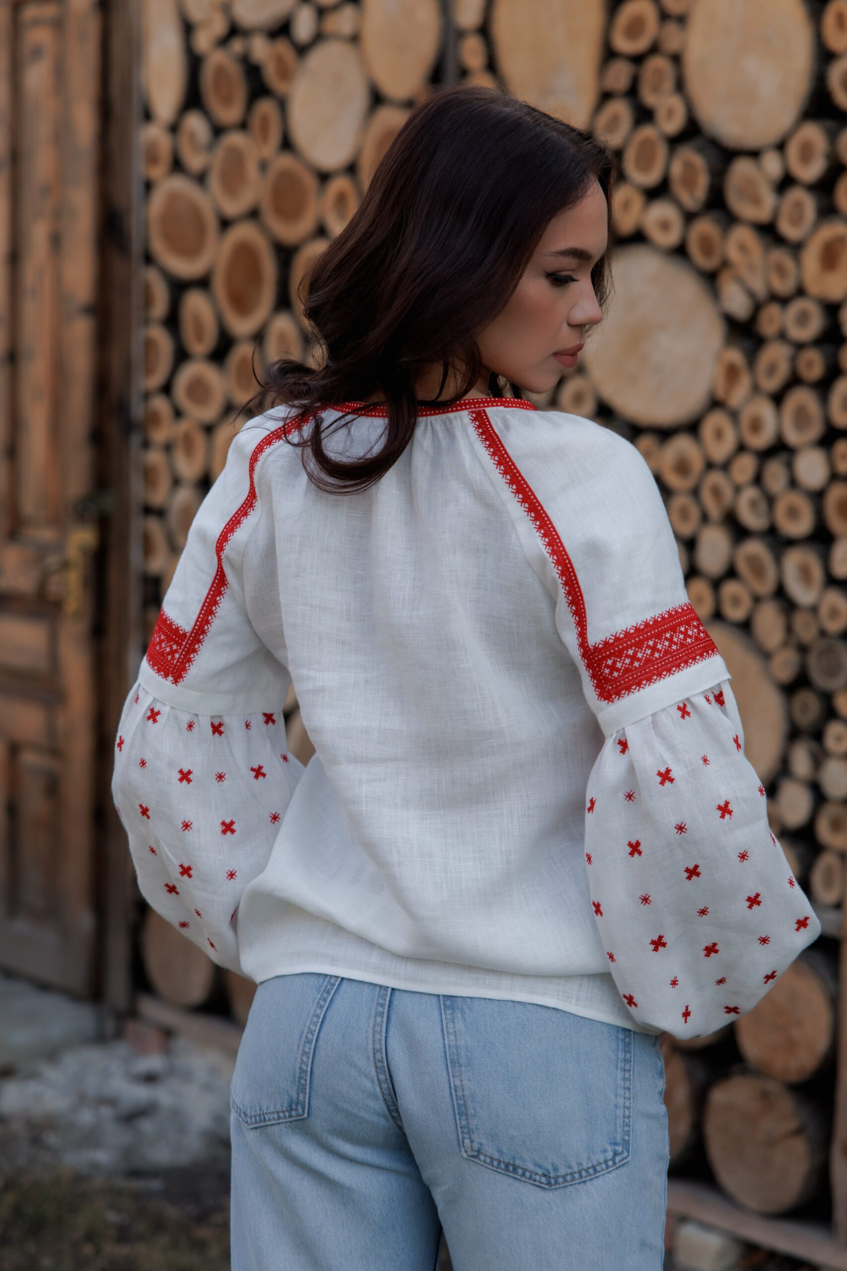 Лляна блуза молочного кольору з вишивкою у техніці хрестик. Застібається на гачечок. На плечах присутня батистова підкладка, яка додає виробу комфорту.