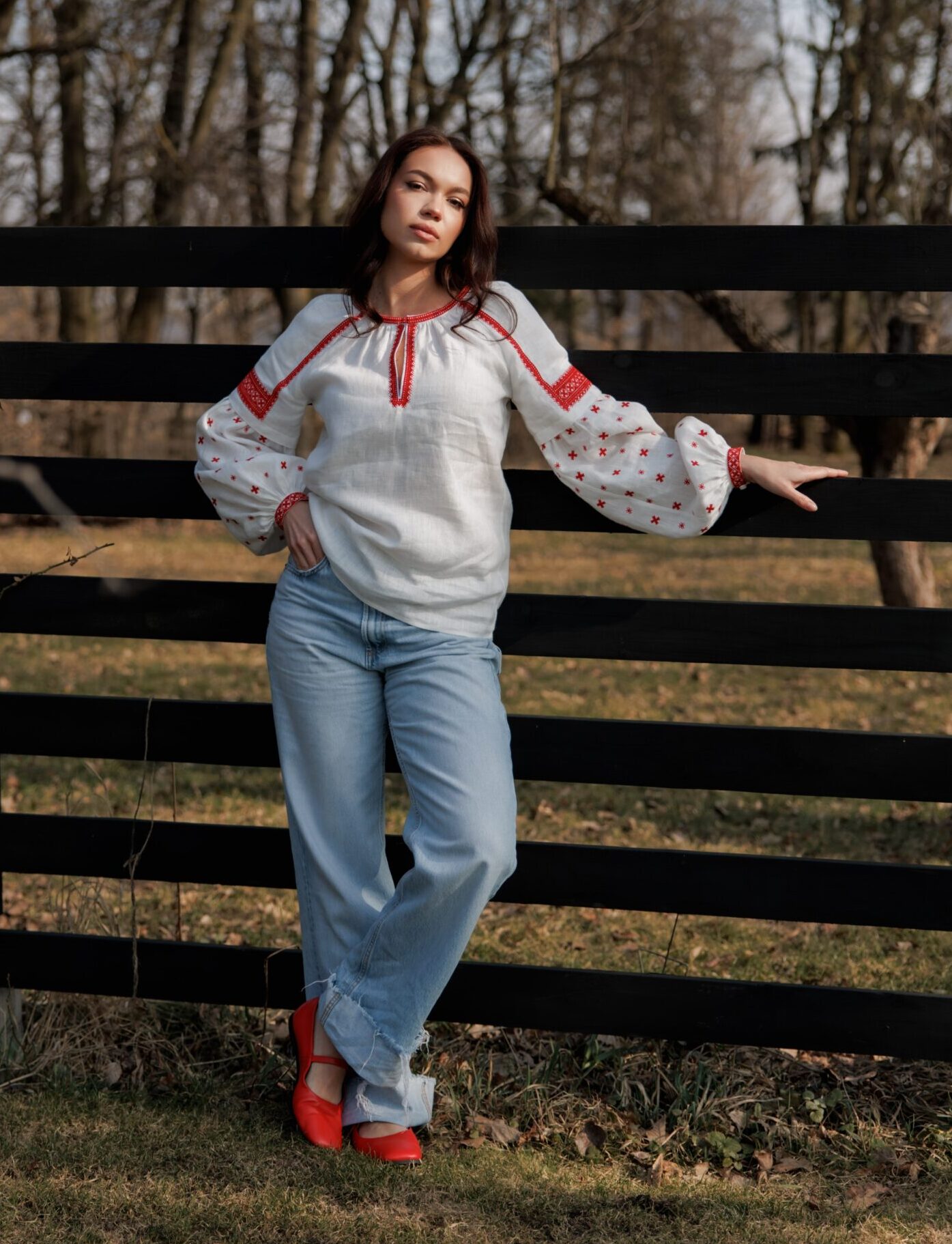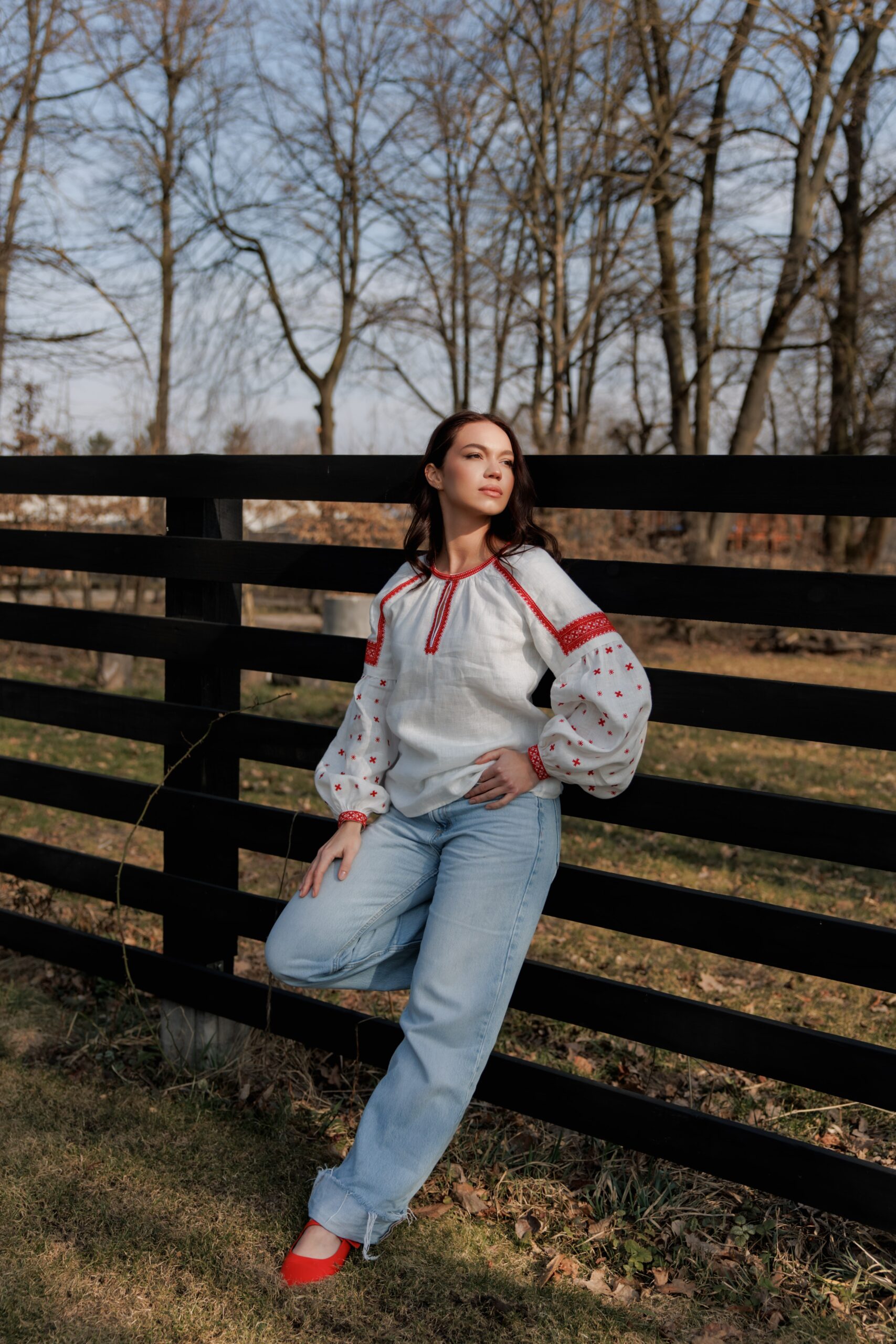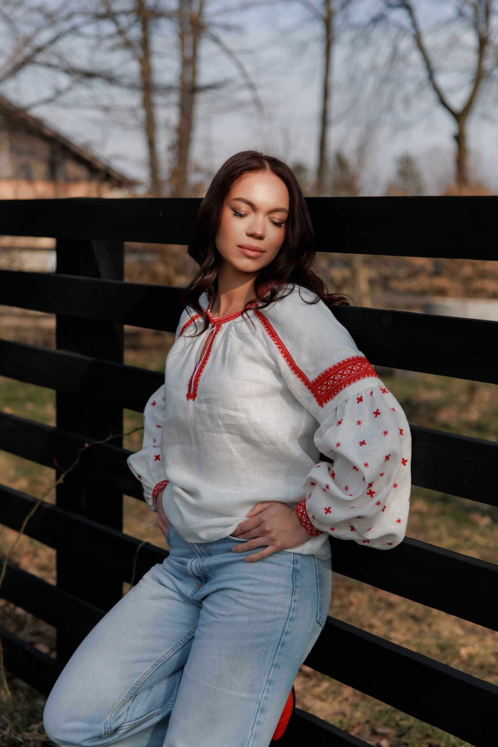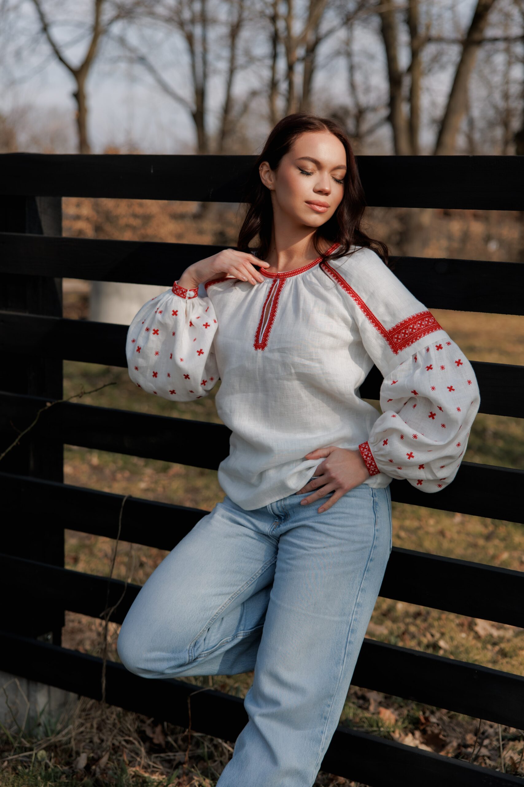Лляна блуза молочного кольору з вишивкою у техніці хрестик. Застібається на гачечок. На плечах присутня батистова підкладка, яка додає виробу комфорту.